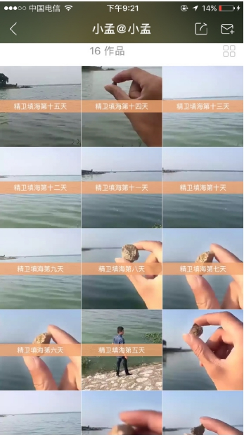 有人滴水,有人移山,自然就有人填海。填海的這位神人快手名字叫小孟@小孟,每天堅持把一顆石子放進(jìn)海里就是他的填海事業(yè)。這個來源于中國上古時代的神話故事,講述了炎帝神農(nóng)氏的小女兒在海中淹死后化作神鳥,每天叼來石子投入東海,“精衛(wèi)填?!北缓笕擞脕硇稳輬猿植恍傅木瘛P⌒〉氖^面朝大海顯得是那么渺小無力,現(xiàn)實中填海幾乎是無法實現(xiàn)。很顯然,這個行為的目的并不是真要用石頭把海填成陸地,而是要在平淡無奇的生活中尋覓一種簡單的樂趣。