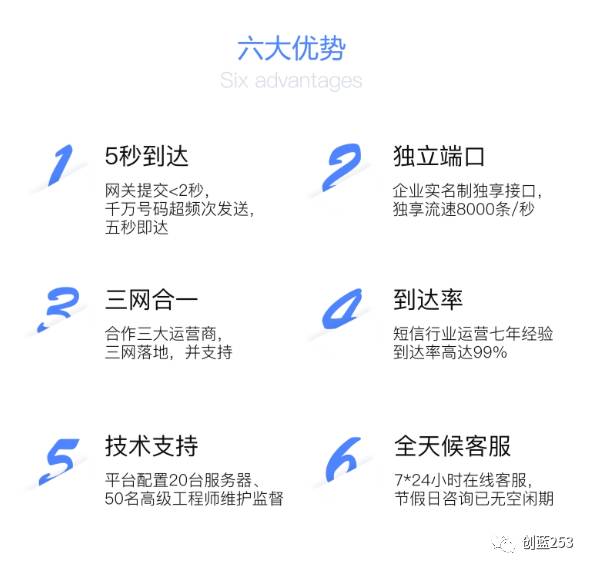 作為互聯(lián)網(wǎng)垂直領(lǐng)域快速發(fā)展的典型代表,論體量,創(chuàng)藍(lán) 253 與行業(yè)巨頭還有些許差距;論影響力,創(chuàng)藍(lán) 253 為短信行業(yè)重新制定產(chǎn)品價格,社群營銷等樹立了新的發(fā)展尺度;論行業(yè)創(chuàng)新,創(chuàng)藍(lán) 253 為行業(yè)貢獻(xiàn)了 5 秒必達(dá),獨立端口,三網(wǎng)合一,高達(dá)到率,技術(shù)支持,全天候客服,可追蹤短鏈接, 空號檢測,上行回復(fù)等新的技術(shù)與辦事尺度。