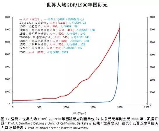 我們看到,人類歷史從公元初年至今,人均GDP曾長(zhǎng)期徘徊在低水平。具體來(lái)說(shuō),到1800年,只增長(zhǎng)了50%擺布。但是從1800年開(kāi)始,人均GDP突然爬上一個(gè)陡坡,至今200多年根據(jù)可比價(jià)格增長(zhǎng)了幾十倍。發(fā)生了什么?