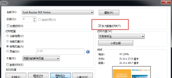 打開(kāi)打印窗口,打印機(jī)的名稱(chēng)請(qǐng)選擇:Foxit Reader PDF Printer,勾選:作為圖像打印,點(diǎn)擊“確定”即可生成不成編纂的PDF文檔。