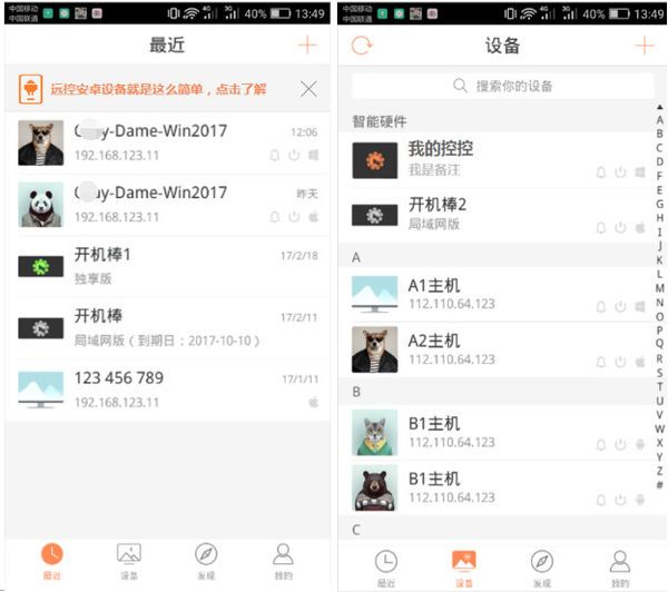 其他交互優(yōu)化如導航欄添加“比來”使用記錄,常使用的主機設備會顯示在列;“設備”導航處,當所綁定控制的主機設備數(shù)量達到 20 個時,將像字母挨次擺列像電話簿邊條的形式展示,便利查找,當然,你也可以搜索關鍵詞查找。