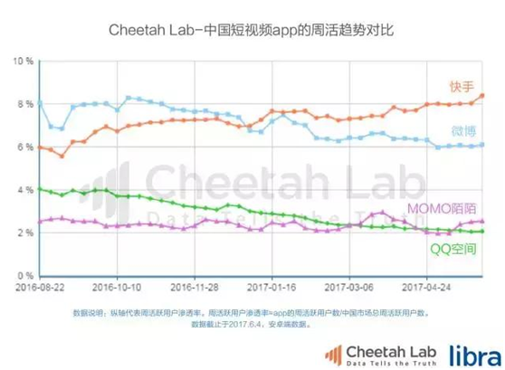 Cheetah Lab把除微信、QQ兩個頭部app之外的社交app的周活躍趨勢放在同一個內外,可以清楚地看見,快手在2017年初超越微博,隨后一路狂奔,是目前社交第二陣營中活躍用戶最多、發(fā)展勢頭最好的app。