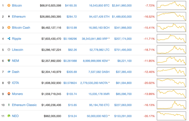 新浪科技訊 北京時間 9 月 5 日早間消息,在連續(xù)幾個月的上漲之后,幾乎所有數(shù)字加密貨幣的價格都在過去 48 小時內(nèi)出現(xiàn)了兩位數(shù)的跌幅。通過Coinmarketcap.com可以看到所有這些數(shù)字加密貨幣的行情。其中,比特幣過去幾天價格下跌了16.5%,而以太坊下跌了23.5%。