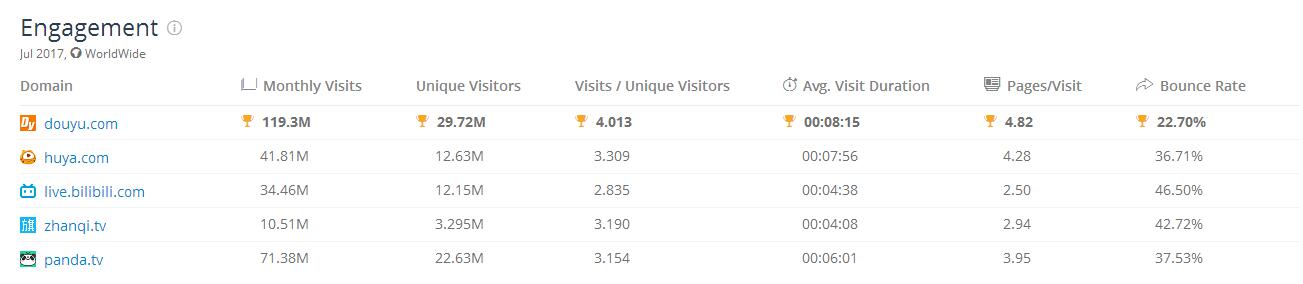 從近一個月的網(wǎng)站互動量來看(包羅日平均拜候數(shù)、日平均拜候時長、打開次數(shù)、跳出率等等),斗魚幾乎在所有數(shù)據(jù)中取得了競品最高水平,月拜候人數(shù)在近一個月中超過 1 億人,獨立拜候量是虎牙、Bilibili的兩倍以上。平臺高用戶粘性、活躍度成為斗魚高用戶價的基礎(chǔ)。