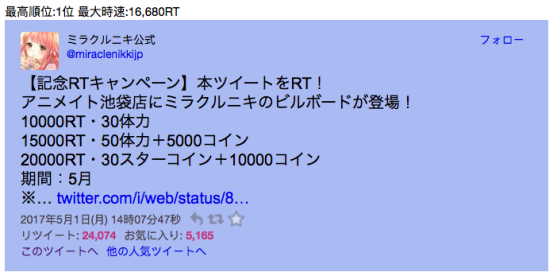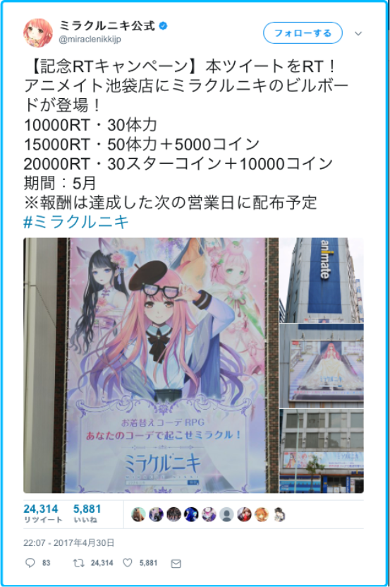 線下線上聯(lián)動(dòng)結(jié)合,這是面對(duì)消費(fèi)者用戶提高推廣效果極佳手段。當(dāng)Animate戶外廣告打出后,CLICK TECH利用《暖暖》官方Twitter推送了《暖暖華麗“換裝”池袋animate》的廣告現(xiàn)場(chǎng)畫面推送,得到粉絲的瘋狂轉(zhuǎn)發(fā),迅速成為當(dāng)日轉(zhuǎn)推速度最高的話題。利用Twitter開展的這次事件營(yíng)銷,其傳播速度之迅疾,參與粉絲之熱情,都遠(yuǎn)遠(yuǎn)超出預(yù)想。