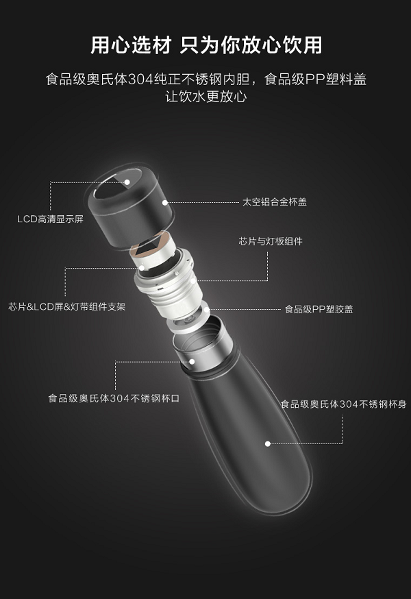 “小水怪SGUAI”智能隨身杯為了讓用戶更好的使用,突破很多技術難點。大小可以存放400ml的水量, 比擬其它智能水杯智能方案,小水怪智能隨身杯把整體方案都設計在了杯蓋中,在小小的杯蓋上,塞進了觸摸屏、LED點陣屏、主pcb板、Ari-elastic監(jiān)測組件。杯蓋的可拆換電池倉內(nèi)置兩顆鋰錳電池,底部設計了一塊防滑硅膠墊采用食用級304不繡鋼,夾層鍍銅工藝可以很好的保證保冷效果。同時,在溫度顯示的結果可以實時關注杯子里面的飲用水,更直不雅觀的了解水質等情況。