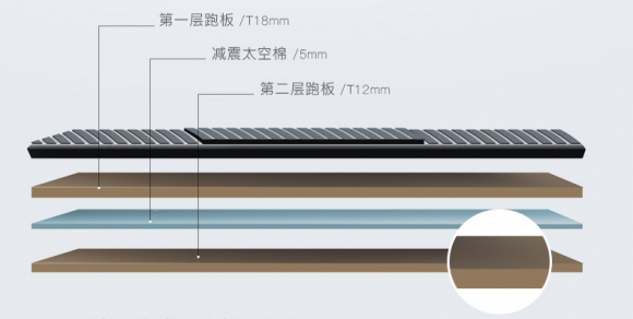 復(fù)健式雙層加密跑板采用t18+t12 跑板兩塊疊并,加大跑臺(tái)厚度,加強(qiáng)承重,多層護(hù)足結(jié)構(gòu),舒適不變回彈,消音緩震。
