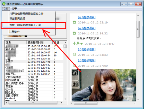 5,到此為止,在電腦上查看手機(jī)上的微信聊天記錄的功能就實(shí)現(xiàn)了,但該軟件還提供一個(gè)更牛逼的功能,那就是找回手機(jī)上刪除的微信聊天記錄,方法很簡單,請(qǐng)看下圖中箭頭指向的菜單,對(duì),我們點(diǎn)擊該菜單即可。