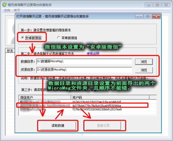 4,接下來我們需要用到一款手機(jī)數(shù)據(jù)恢復(fù)軟件,軟件名稱為“樓月微信聊天記錄導(dǎo)出恢復(fù)助手”,該軟件是提供試用功能的,我們可以在百度上對(duì)其進(jìn)行搜索并免費(fèi)下載,打開軟件后,按下圖進(jìn)行設(shè)置即可。