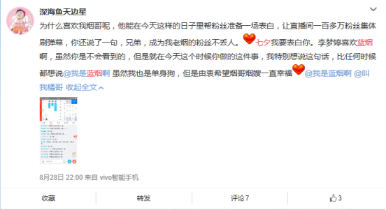 七夕為粉絲評(píng)釋,藍(lán)煙和煙嫂已經(jīng)恩愛(ài)了許久,把這份長(zhǎng)長(zhǎng)久久的幸福,在直播間繼續(xù)傳遞出去,幫手更多粉絲得到幸福,實(shí)力寵粉,寵身邊的人,這就是活潑可愛(ài)的藍(lán)煙。有時(shí)候也會(huì)看到煙哥為黑粉心煩,不過(guò)做本身就好了,“王”不相信眼淚,只有這一份真性情。