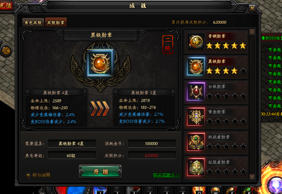 最后看看傲天藍(lán)月傳奇的成就勛章。小編目前是黑鐵勛章 4 星,生命上限:2589,物理攻擊:166-250,減少受英雄傷害:2.4%,受boss傷害減少:2.4%。如果能達(dá)到 5 星呢?黑鐵勛章 5 星,生命上限:2878,物理攻擊:185-276,減少受英雄傷害:2.7%,受boss傷害減少:2.7%對(duì)比下戰(zhàn)力更加牛逼。想要更牛逼就趕緊升級(jí),需要角色等級(jí)達(dá)到 60 級(jí),消耗金幣 100000 角色、成就積分 630000 才能升一星,滿 10 星升一階。從青銅勛章、黑鐵勛章到白銀勛章、黃金勛章、挑戰(zhàn)者勛章、征服者勛章,傲天藍(lán)月傳奇小伙伴們?yōu)榱斯Τ擅鸵恢迸Π?