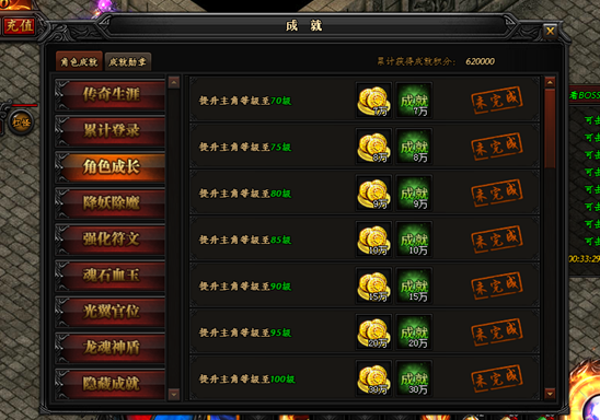 角色成長(zhǎng)中的成長(zhǎng)任務(wù)主要看等級(jí), 70 級(jí)為獎(jiǎng)勵(lì)基數(shù)。提高主角等級(jí)至 70 級(jí)可收獲 7 萬金幣+ 7 萬成就,到 100 級(jí)可收獲 30 萬金幣+ 30 萬成就。還有 200 級(jí)就不給你展示了,本身到傲天藍(lán)月傳奇里不雅觀摩下吧。