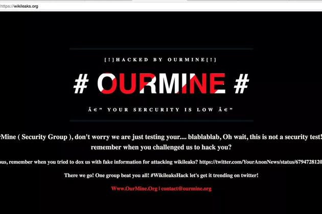 被篡改的網(wǎng)站上寫著:“嗨,我們是OurMine,別擔心,我們只是在測試你們的……哦,,等一下,這可不是安適測試。維基解密,還記得你們曾經(jīng)搬弄我們,讓我們?nèi)肭帜銈儐?”