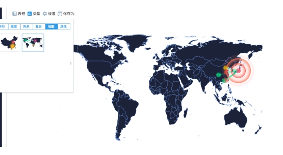 2 軌跡地圖:豐富網(wǎng)絡(luò)攻擊、用戶行程等場景的數(shù)據(jù)可視化,幫手用戶了解來源地址和目的地址的拜候關(guān)系和熱度。