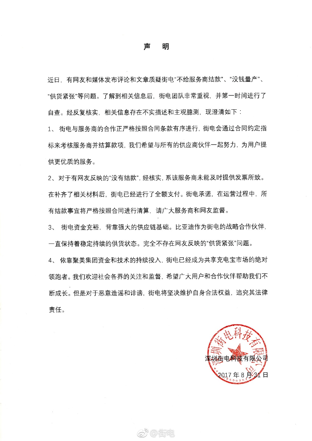 站長之家(Chinaz.com) 8 月 31 日 近日,有消息稱共享充電寶公司街電科技出現(xiàn)“不給辦事商結(jié)款”、“沒錢量產(chǎn)”、“供貨緊張”等問題。對于該傳聞,街電官方做出了解釋。
