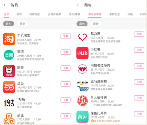 這一點從 360 手機助手上最能直不雅觀地看出,在 360 手機助手平臺上,網(wǎng)購類APP早已高達上千款。其中,下載量超過千萬的網(wǎng)購類APP就有幾十家,多家APP更是達到了上億級別。而隨著夏秋換季的到來,其下載量更是在不停飆升。與此同時,除了綜合性購物網(wǎng)站,各種垂直類購物APP也備受追捧。其中,海淘購物類APP的表示就相當(dāng)亮眼,不但數(shù)目眾多,下載量更是急劇飆升。主打種草攻略類的小紅書,定位美妝產(chǎn)品的唯美美妝、定位全球奢侈品的寺庫奢侈品等等都成為了網(wǎng)友的心頭好!