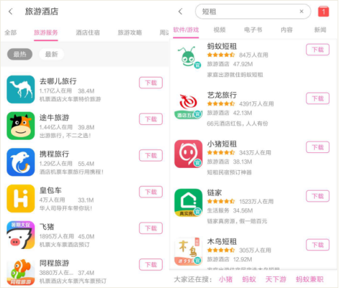 不過,相對于以前旅游高峰期酒店類APP受追捧,本年秋季出游,短租等共享房屋類APP受到了青睞。 360 手機助手大數(shù)據(jù)監(jiān)測發(fā)現(xiàn),隨著秋季出游高峰期逐漸臨近,短租類APP的下載量迅速暴增,截至目前,已有 7 款A(yù)PP的下載量達到了百萬級別。