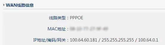 光貓的設(shè)置倒是沒有任何異常,依舊處于橋接模式,但撥號(hào)路由器原本獲取到外網(wǎng)IP,卻釀成了100.72.x.x/100.64.x.x形式的IP,實(shí)測(cè)之后發(fā)現(xiàn)外網(wǎng)實(shí)際獲取到的IP和路由器自身的IP完全差別!難道是釀成了是坑爹的寬帶運(yùn)營(yíng)商把我們釀成了大局域網(wǎng)?。?/p>