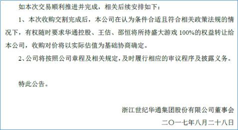 2017 年 8 月 28 日,浙江世紀(jì)華通集團(tuán)股份有限公司(以下簡(jiǎn)稱“世紀(jì)華通”)發(fā)布公告(股票代碼002602),控股公司華通控股和第二大股東邵恒、第三大股東王佶擬收購(gòu)盛大游戲剩余9.08%的股權(quán)。也就是說(shuō),世紀(jì)華通控股公司及兩位大股東將合計(jì)間接持有盛大游戲100%的股權(quán),擁有盛大游戲?qū)嶋H控制權(quán)。