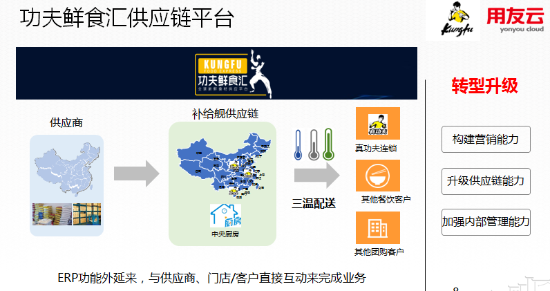從信息化角度,功夫鮮食匯借助用友營銷云,將ERP功能不停延伸,做成一個供應鏈平臺。與供應商、門店或客戶直接互動來完成業(yè)務。這種業(yè)務轉(zhuǎn)型和平臺化的發(fā)展帶來了業(yè)務方面的能力的提升:包孕升級供應鏈的能力,構(gòu)建營銷能力,加強內(nèi)部辦理能力。王孟杰強調(diào),尤其是辦理能力,都要依賴于這種信息技術(shù)的支持。在這種能力下,真功夫的信息化發(fā)展逐步融入移動化,云計算和大數(shù)據(jù)的方式,越來越多地走向云端。