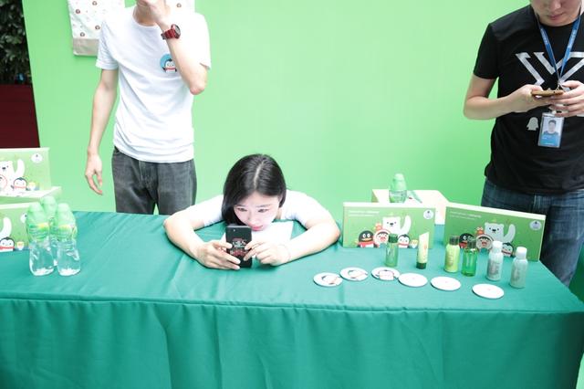現(xiàn)場工作人員抵不住萌萌QQfamily的誘惑,辛苦之余也給本身來了一張萌萌的寵愛自拍。