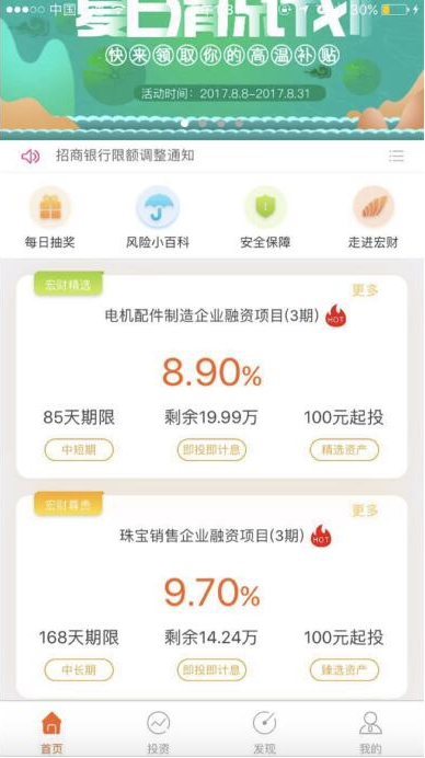 2017 年 8 月 8 日宏財網(wǎng)新版app正式上線,經(jīng)過產(chǎn)品部與技術(shù)部近一個地設計、編程、測試,新版app從ui到項目展示再到個人中心均有差別程度上到調(diào)整,給用戶以耳目一新到感覺和更順暢到使用體驗。