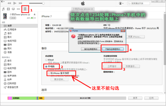 一、蘋(píng)果手機(jī)短信刪除了怎么恢復(fù)查看1,將iPhone手機(jī)用平時(shí)充電的數(shù)據(jù)線連接到電腦上,然后在電腦上安置并打開(kāi)iTunes軟件,按下圖所示挨次將iPhone手機(jī)中的所有文件和數(shù)據(jù)都備份到電腦上。