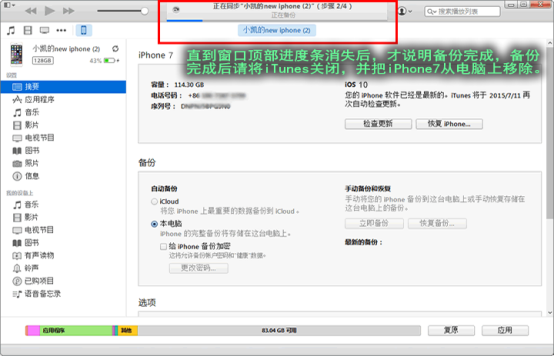 2,備份時(shí)間與手機(jī)中短信的多少無(wú)關(guān),而主要與手機(jī)中app的多少及拍攝的相片視頻多少有關(guān),通常會(huì)比較久,請(qǐng)耐心等待,備份完成后,請(qǐng)把iTunes軟件關(guān)閉,并把iPhone手機(jī)從電腦上移除。