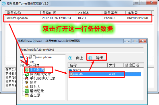 3,接著在電腦上安置并打開(kāi)“樓月免費(fèi)iTunes備份辦理器”軟件,蘋(píng)果手機(jī)中的所有短信內(nèi)容均存儲(chǔ)在一個(gè)名為sms.db的文件中,我們按下圖所示步驟,把這個(gè)小小的文件從備份數(shù)據(jù)中導(dǎo)出來(lái)。