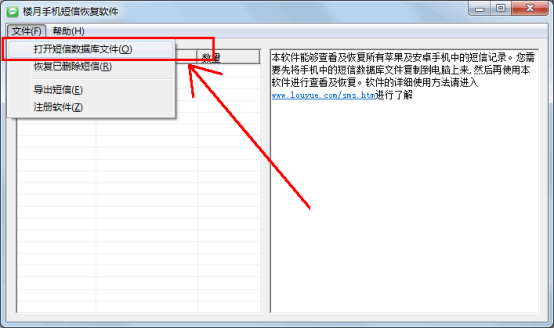 5,打開(kāi)剛安置的樓月手機(jī)短信恢復(fù)軟件,,使用該軟件打開(kāi)前面導(dǎo)出的sms.db文件。