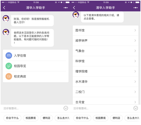 此次推出的“清華入學(xué)助手”是搜狗搜索為清華大學(xué)深度定制的智能問答客服系統(tǒng),依托搜狗搜索領(lǐng)先的智能問答技術(shù),以搜狗汪仔的形象作為客服角色,以人機(jī)智能對(duì)話回答提問作為主要辦事方式,同時(shí)提供了傳統(tǒng)的報(bào)到流程、住宿規(guī)章、生活指南等結(jié)構(gòu)化的信息呈現(xiàn)。