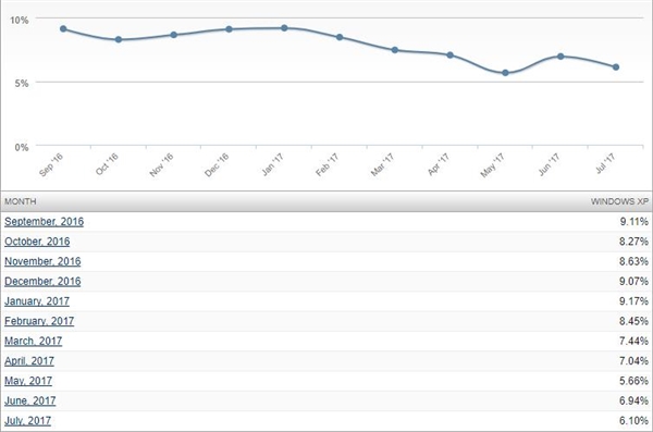 NetMarketShare的數(shù)據(jù)顯示,Windows XP目前仍舊占據(jù)6.10%的份額,比上個月下降0. 84 個百分點(diǎn),但比 5 月份還高了0. 44 個百分點(diǎn)。