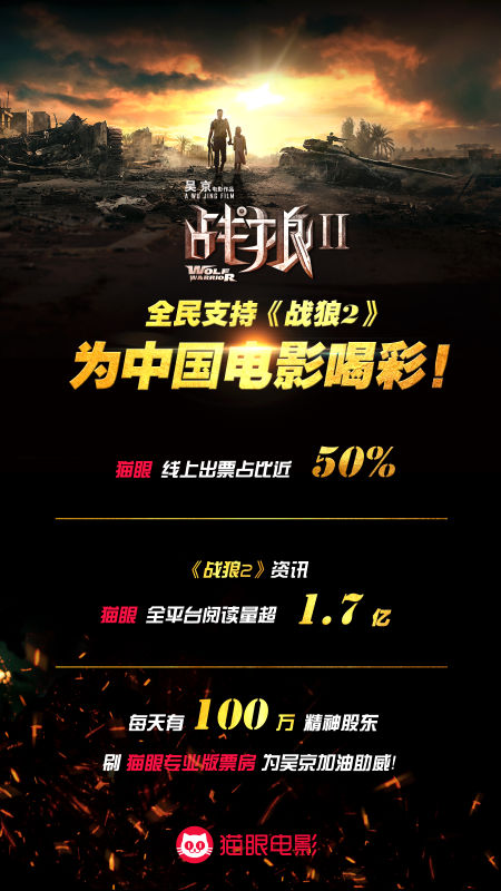《戰(zhàn)狼2》的票房成功和全民狂歡,讓國(guó)人看到中國(guó)電影市場(chǎng)的潛力,為中國(guó)電影人注入新的力量和信心,,同時(shí)也顯示了貓眼電影在鞭策電影項(xiàng)目成功運(yùn)作中的平臺(tái)化基礎(chǔ)設(shè)施能力,這一能力將隨著更多優(yōu)秀國(guó)產(chǎn)電影的成功逐步展示出更廣泛的產(chǎn)業(yè)價(jià)值。