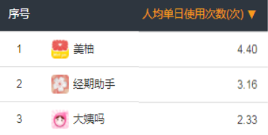 人均單日使用次數(shù)是衡量APP使用頻率的一項(xiàng)重要尺度。7月QuestMobile數(shù)據(jù)顯示,美柚人均單日使用次數(shù)4.40次,第二名經(jīng)期助手為3.16次,大姨嗎僅排第三,為2.33次。