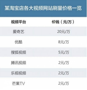 按照《娛樂本錢論》去年的報(bào)道,如果在淘寶搜索“刷流量”等關(guān)鍵詞,可以輕易找到報(bào)價(jià) 1-5 元/萬次播放量不等的刷量產(chǎn)品:“騰訊、土豆 1 元 1 萬;愛奇藝、樂視 2 元 1 萬;搜狐 4 元 1 萬;優(yōu)酷 5 元 1 萬。”從報(bào)價(jià)看,也可以大致估算各平臺(tái)對(duì)刷量行為的打擊力度,優(yōu)酷和搜狐是最嚴(yán)格的。不過,目前你再去淘寶上看,這些關(guān)鍵詞已經(jīng)被屏蔽。而在本年 4 月,央視曾報(bào)道的影視行業(yè)數(shù)據(jù)造假事件中,刷量公司報(bào)價(jià)稱在愛奇藝刷量需要 40 元/萬條,可見平臺(tái)正在加緊打擊這類行為。