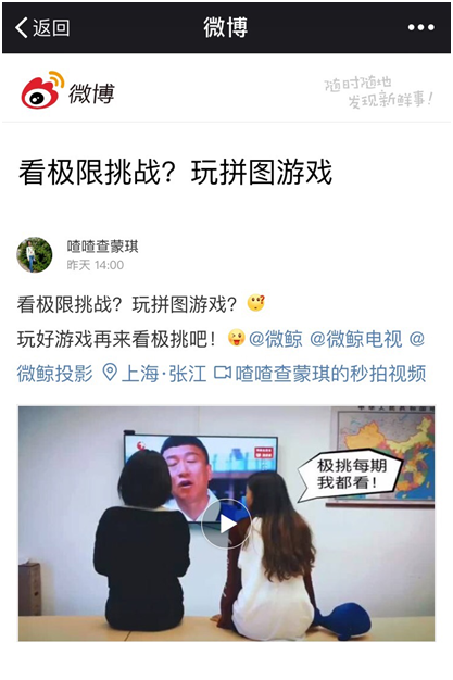 近日,一段網(wǎng)友Po出的微鯨電視拼圖小視頻刷爆網(wǎng)絡(luò),引起熱議。視頻中,兩位女生打開微鯨電視,在微鯨電視首頁前腦洞大開玩拼圖游戲玩到飛起,組團(tuán)完成了微鯨品牌LOGO的拼圖游戲,闖關(guān)成功,,抱得“電視”歸。本來,這是一向崇尚“愛玩才會贏”的微鯨打開freestyle的大門,推出的最新互動游戲,用戶每天在微鯨電視上完成拼圖游戲,闖關(guān)成功即可獲取抽獎機會,獎品寶箱則是微鯨43D電視、樂高積木、托馬斯小火車及微鯨周邊獎品等。