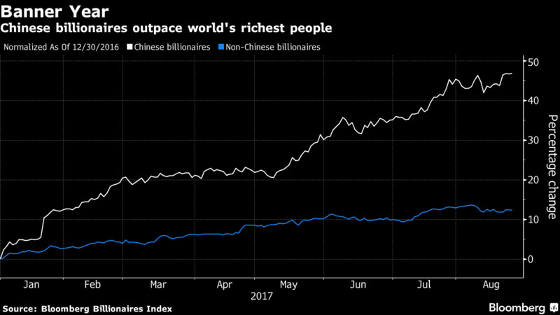 自去年年底以來,彭博億萬富翁指數(shù)上的 40 位中國億萬富翁的凈資產(chǎn)上漲了46.8%,占據(jù)了各國億萬富翁財(cái)富增長的大部分,總凈資產(chǎn)增長至 4170 億美元。