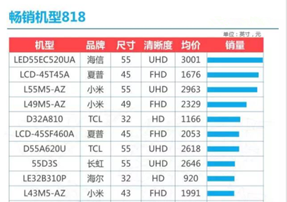 據(jù)數(shù)據(jù)統(tǒng)計顯示,在歷經(jīng)連續(xù) 7 個月的市場消沉后,由蘇寧主導(dǎo)的“ 818 發(fā)燒購物節(jié)”,彩電市場以銷量同比增長66%,銷售額增長102%的業(yè)績頒布頒發(fā)了低迷期的結(jié)束。這是 7 個月來彩電整機(jī)廠商一次痛快的增長。其中 55 吋大平板的銷售占比達(dá)到了32.1%,而海信 55 英寸4K電視EC520UA更是摘得頭名,銷量達(dá)到 22296 臺,位列所有單品型號暢銷的第一。