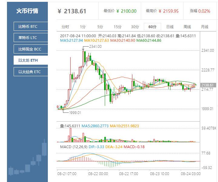 按照以太坊交易平臺火幣網行情顯示,截至北京時間 8 月 24 日 11 點,以太坊價格為2138. 61 元人民幣。火幣網以太坊今日開盤價格為2138. 02 元,目前最高價格為2159. 95 元,最低價格為2100. 00 元,漲幅0.02%。
