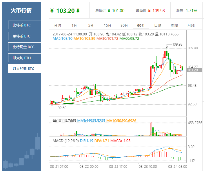 按照以太經典交易平臺火幣網行情顯示,截至北京時間 8 月 22 日 13 點,以太經典價格為103. 20 元人民幣?;饚啪W以太經典今日開盤價格為95. 81 元,目前最高價格為109. 98 元,最低價格為101. 00 元,跌幅1.71%。