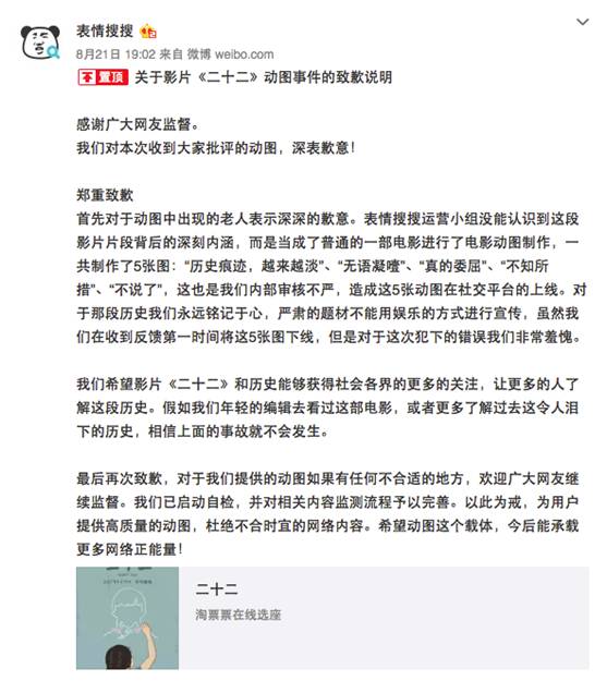 “確實(shí)是無心之過!”似顏繪相關(guān)工作人員如是告訴地歌網(wǎng),公司一位年輕的設(shè)計(jì)人員出于“鞭策更多的人關(guān)注《二十二》電影及慘痛歷史”的目的而推出了這五張動(dòng)圖,但是在政治意識(shí)與道德考量沒有充分論證的情況下倉促上線,充分袒露了公司的內(nèi)容監(jiān)測(cè)流程的不完善。