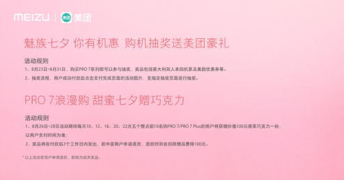 8 月 23 日- 28 日期間,只要在魅族商城購(gòu)買PRO7 系列手機(jī),在魅族社區(qū)帖曬出購(gòu)買魅族PRO7 的頁面,踩中固定樓層,即可獲得意大利七夕雙人往返機(jī)票。此外更有魅友家定制手提包、魅族EP- 51 耳機(jī)、海量美團(tuán)優(yōu)惠券等福利等著你!同時(shí),還有價(jià)值 100 元的美團(tuán)西餐、紅酒、咖啡、披薩、電影等多品類美食優(yōu)惠券送出……七夕,就該這么過!