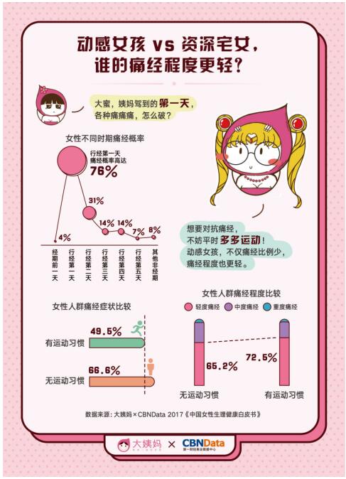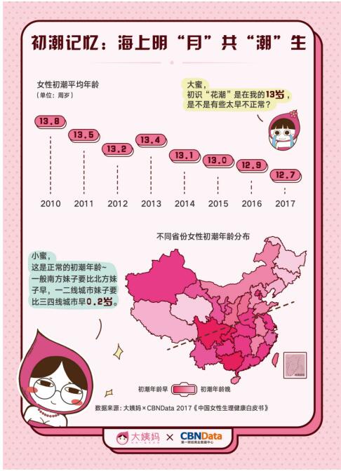 想知道女性在私護(hù)健康領(lǐng)域的消費(fèi)情況嗎?想了解全國(guó) 31 個(gè)省市的姐妹們?cè)谠陆?jīng)、兩性、備孕及相關(guān)消費(fèi)領(lǐng)域有哪些異同嗎?一起踏上解讀《白皮書》之旅吧! 月經(jīng)篇:初潮年齡大幅提前 多數(shù)人被“經(jīng)期不調(diào)” 動(dòng)感女孩痛經(jīng)少 《白皮書》顯示:2010 年- 2017 年,女性初潮年齡平均提前了 1 歲, 00 后的性發(fā)育年齡更是提前至12. 7 歲,同時(shí)北方地區(qū)女性平均初潮年齡晚于南方地區(qū),一二線城市女性初潮年齡比三四線城市早0. 2 歲。