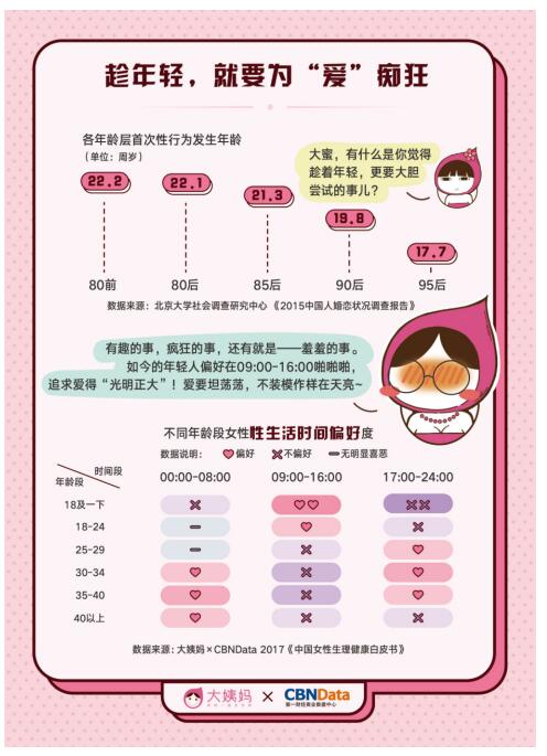 兩性篇:年輕人愛得“關(guān)明正大”,女性情趣用品需求釋放 目前,新生代的性成熟時(shí)段明顯提前,95 后的首次性行為平均年齡為17. 7 歲。從男女的性激素水平看,早上6- 9 點(diǎn)男女性激素水平偏高,該時(shí)段是性生活的最佳時(shí)期。數(shù)據(jù)顯示, 24 歲以下女性更偏好在白日 9 點(diǎn)- 16 點(diǎn)期間性愛。