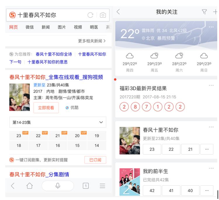 此次升級(jí)最大的亮點(diǎn)在于,通過新版搜狗搜索APP“我的關(guān)注”功能,可以實(shí)現(xiàn)對(duì)熱播影視綜藝的一鍵訂閱,用戶無需反復(fù)搜索即可持續(xù)跟蹤訂閱內(nèi)容的最新動(dòng)態(tài)。例如,用戶在搜索《春風(fēng)十里不如你》時(shí),想要持續(xù)了解這部劇的最新動(dòng)態(tài),只需點(diǎn)擊頁面下方“立即訂閱”,待該熱播劇有信息更新時(shí),系統(tǒng)就會(huì)“彈窗”提醒。用戶也能通過“個(gè)人中心”-“我的關(guān)注”隨時(shí)查詢它的最新進(jìn)展。據(jù)悉,除了熱門影視綜藝以外,“我的關(guān)注”目前還支持對(duì)城市天氣、所有彩種彩票的開獎(jiǎng)結(jié)果、搞笑段子等內(nèi)容的一鍵訂閱,,用戶可按照個(gè)人興趣選擇訂閱本身專屬的個(gè)性化搜索內(nèi)容。