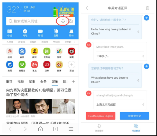 相信很多童鞋都遇到過這樣的狀況,一要跟外國人交流就緊張,一緊張就想不起來單詞,最后磕磕巴巴的說出來的中式英語,只能換來對方的一臉茫然?,F(xiàn)在,你只需淡定的打開搜狗手機瀏覽器,點擊搜索欄右側(cè)的“話筒”然后對著手機說出你想翻譯的話,搜狗手機瀏覽器就會翻譯成對方的語言并說給外國友人聽,中英互譯做到信達雅。有了搜狗手機瀏覽器,再也不能擔心本身的英文不夠好,輕輕松松就能達到八級交流水平。
