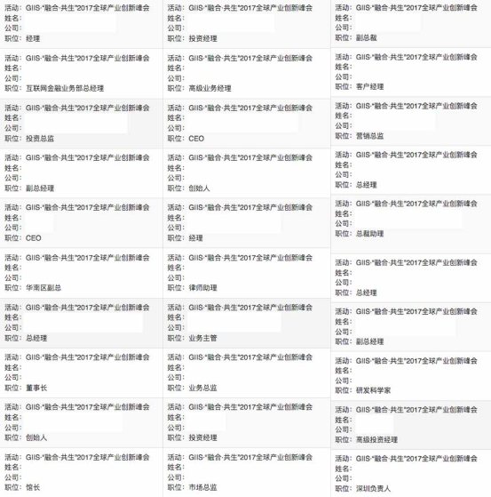 本次大會參會人數(shù)將達到3000人次,行業(yè)跨越廣泛,按照億歐歷次活動的報名統(tǒng)計,80% 為企業(yè)高管,參會者質(zhì)量業(yè)內(nèi)屬于高水平。(下圖為GIIS峰會的部分報名情況,已隱去報名者姓名和公司名。)