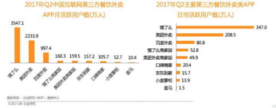 另?yè)?jù)比達(dá)咨詢公布的 2017 年Q2 外賣數(shù)據(jù),在APP月活與日活用戶數(shù)上,餓了么的月活用戶數(shù)達(dá)到 3547 萬(wàn)人,日活用戶數(shù) 347 萬(wàn)人,兩項(xiàng)指標(biāo)均領(lǐng)跑美團(tuán)外賣。