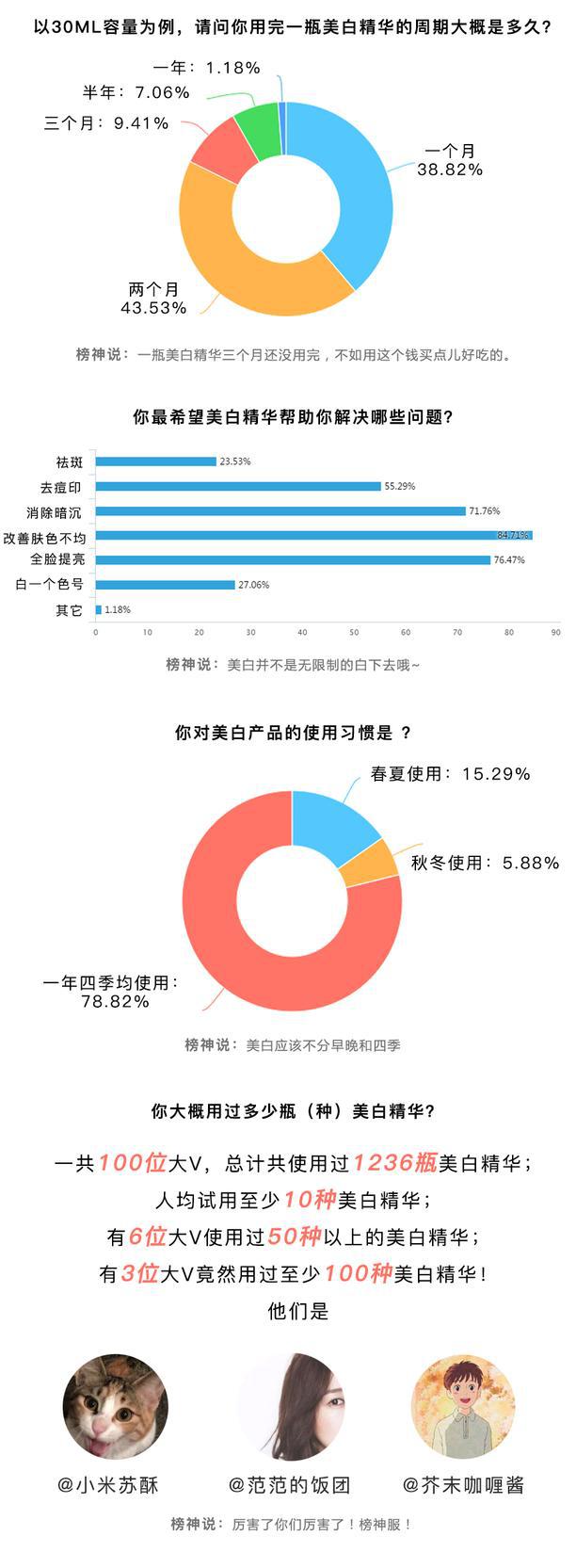 經(jīng)過(guò) 100 位美妝博、 1000 瓶美白精華、 100 多個(gè)品牌的綜合口碑結(jié)果,最終得出了如下結(jié)果: