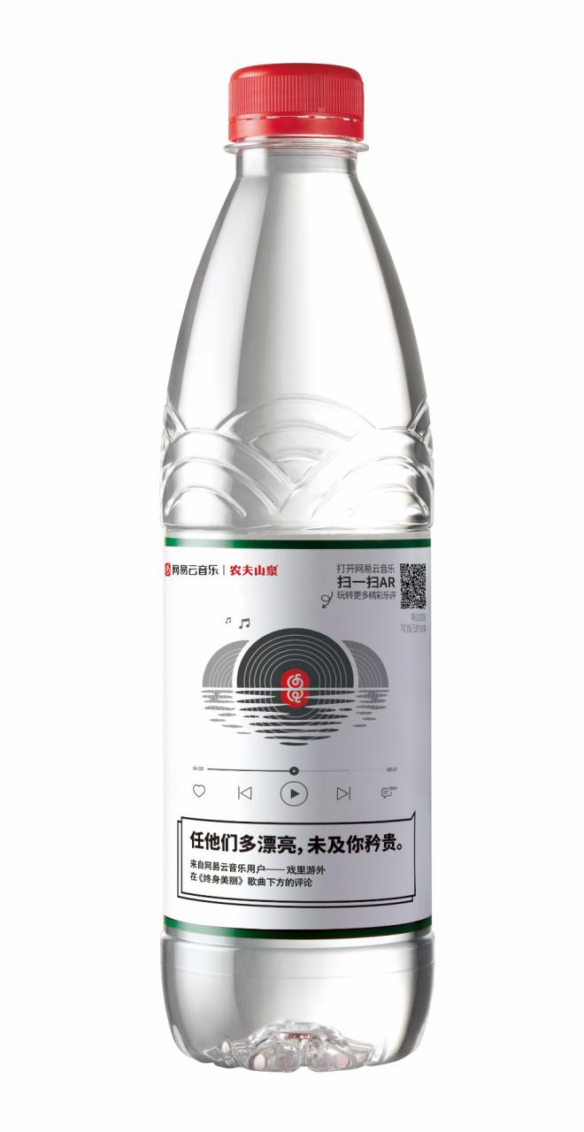 這次,網(wǎng)易云音樂又精選了 30 條用戶樂評(píng),印制在 4 億瓶農(nóng)夫山泉飲用天然水瓶身,目前這款“樂瓶”水已在北京、上海、杭州等全國 69 個(gè)城市首發(fā),京東同步聯(lián)合發(fā)售。得益于水瓶的可移動(dòng)性,目測(cè)此次輻射面積更為寬廣。